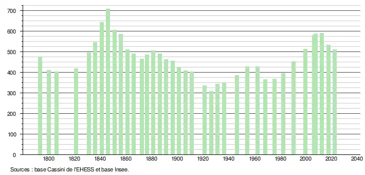 L'évolution du nombre d'habitants est connue à travers les recensements de la population effectués dans la commune depuis 1793. Pour les communes de moins de 10 000 habitants, une enquête de recensement portant sur toute la population est réalisée tous les cinq ans, les populations de référence des années intermédiaires étant quant à elles estimées par interpolation ou extrapolation[37]. Pour la commune, le premier recensement exhaustif entrant dans le cadre du nouveau dispositif a été réalisé en 2007[38].