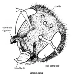 - Femelle : la femelle avec une taille de 10-12 mm est plus grande que le mâle. Elle porte[2] une pilosité noire sur la tête, gris-jaune sur le thorax, brun-clair à roux sur les trois premiers tergites abdominaux et noire sur les derniers. Dessous l'abdomen, elle porte une brosse ventrale jaunâtre, pour le transport du pollen. Sur le front, elle porte deux "cornes" nettes, tronquées, absentes chez le mâle. Il s'agit de deux excroissances, beaucoup plus courtes que les antennes, apparaissant sur le clypeus, au-dessus des mandibules.