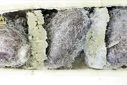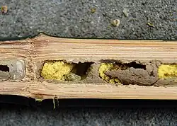 Dans les dernières cellules, la femelle pond des œufs non fécondés qui donneront des mâles et seront les premiers à sortir l'année suivante. Les cellules plus profondes contiennent des œufs fécondés qui donneront des femelles.