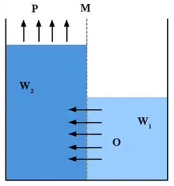La concentration en sel dans le compartiment de l’eau salée étant supérieure à celle dans le compartiment de l’eau douce, l’eau pure migre par osmose à travers la membrane vers le compartiment d’eau salée. Ce transfert augmente la quantité de liquide présente dans le compartiment d'eau salée, ce qui se traduit par une élévation de la colonne d'eau. Le phénomène se poursuit tant que la différence de pression hydrostatique entre les deux compartiments n’atteint pas une valeur limite (limite théorique avec l'eau de mer : 2,7 MPa, soit 27 bars).