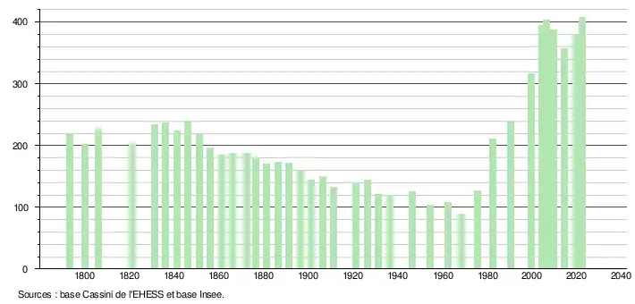 L'évolution du nombre d'habitants est connue à travers les recensements de la population effectués dans la commune depuis 1793. Pour les communes de moins de 10 000 habitants, une enquête de recensement portant sur toute la population est réalisée tous les cinq ans, les populations de référence des années intermédiaires étant quant à elles estimées par interpolation ou extrapolation[21]. Pour la commune, le premier recensement exhaustif entrant dans le cadre du nouveau dispositif a été réalisé en 2004[22].
