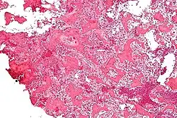 L'aspect habituel présente un stroma fibrovasculaire avec de nombreux ostéoblastes, du tissu ostéoïde, de l'os tissé bien formé et des cellules géantes. Les ostéoblastes étaient généralement petits et de forme régulière[2].