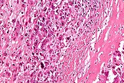 Au microscope la caractéristique de l'ostéosarcome est la présence d'ostéoïde (formation osseuse) dans la tumeur. Les cellules tumorales sont très pléomorphes (anaplasiques), certaines sont géantes, et de nombreuses mitoses sont atypiques. Ces cellules produisent des ostéoïdes décrivant des travées irrégulières (amorphes, éosinophiles / roses) avec ou sans calcification centrale (hematoxylinophilic / bleu, granulaire) - os de la tumeur. Les cellules tumorales sont incluses dans la matrice ostéoïde. Les ostéosarcomes peuvent présenter des cellules géantes ostéoclastiques comme multinucléées[7].