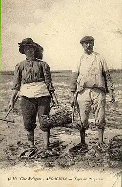 - ↑ Les hommes portent une vareuse et le béret basque. Les femmes portent la benèze (ou bénaise, coiffe ressemblant à la quichenotte vendéenne). Ils sont chaussés des patins de bois (mastoun) qui évitent de s'enfoncer dans la vase des viviers et tiennent les accessoires liés à leur métier : râteau pour étaler les huîtres encore cultivées au sol (technique de l'élevage à plat aujourd'hui disparu) et panier pour les récolter.
