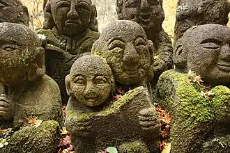 La porte du temple présente deux statues de farouches niō. À l'intérieur du temple se trouvent plus de 1 200 statues en pierre de rakan, les premiers disciples du Bouddha à s'être éveillés. Ces statues, dans le respect des traditions Rakan, sont généralement humoristiques et kawaii. Les sculptures ont été données en 1981 en l'honneur de la rénovation du temple. La plupart ont été sculptées par des amateurs.