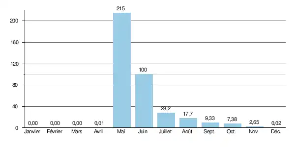 Le débit moyen mensuel observé de janvier à mars (minimum d'étiage) est de 0,00 m3/s, c'est-à-dire arrêt de tout écoulement, tandis que le débit moyen du mois de mai, maximum de l'année se monte à 215 m3/s, ce qui souligne l'amplitude très importante des variations saisonnières, même dans le contexte des cours d'eau sibériens, pourtant caractérisés par des écarts saisonniers importants. Sur la durée d'observation de 6 ans, le débit mensuel maximal s'élevait à 322 m3/s en .
