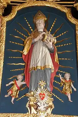 | Attributs | une mitre et une crosse d'abbé mitré, et un tonnelet de vin |