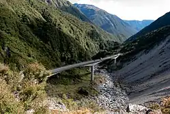 Terminé en 1999 par la société ‘McConnell Smith Pty Ltd’, il avait 440 m de long, quatre piliers et conduisait la route State Highway 73/S H 73 (en) au-dessus d’une étendue de terres instables, remplaçant une section de route étroite, sinueuse et dangereuse, qui était soumise à un grand risque d’avalanches, de glissements de terrain, occasionnant des fermetures fréquentes[6]