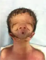 - otocéphalie avec holoprosencéphalie et des malformations faciales comme la cyclopie ou le proboscis (nez en forme de tube) ;