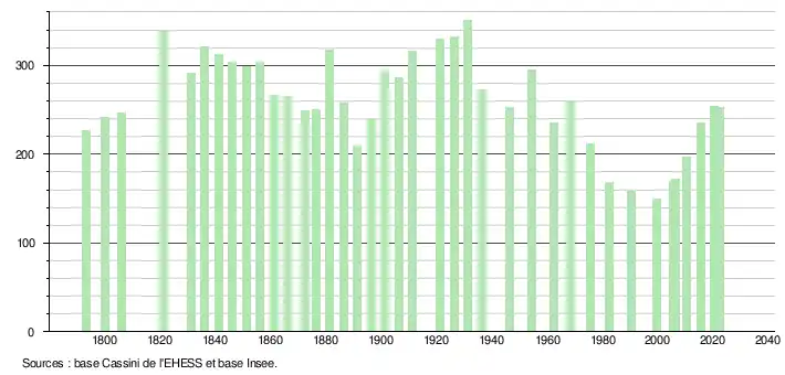 L'évolution du nombre d'habitants est connue à travers les recensements de la population effectués dans la commune depuis 1793. Pour les communes de moins de 10 000 habitants, une enquête de recensement portant sur toute la population est réalisée tous les cinq ans, les populations de référence des années intermédiaires étant quant à elles estimées par interpolation ou extrapolation[17]. Pour la commune, le premier recensement exhaustif entrant dans le cadre du nouveau dispositif a été réalisé en 2005[18].