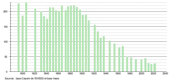 L'évolution du nombre d'habitants est connue à travers les recensements de la population effectués dans la commune depuis 1793. Pour les communes de moins de 10 000 habitants, une enquête de recensement portant sur toute la population est réalisée tous les cinq ans, les populations de référence des années intermédiaires étant quant à elles estimées par interpolation ou extrapolation[16]. Pour la commune, le premier recensement exhaustif entrant dans le cadre du nouveau dispositif a été réalisé en 2006[17].