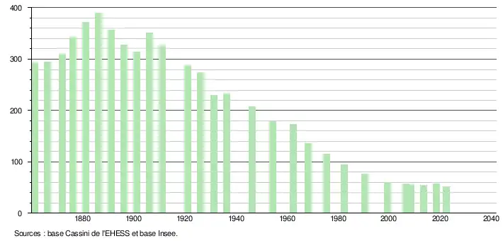 L'évolution du nombre d'habitants est connue à travers les recensements de la population effectués dans la commune depuis 1861. Pour les communes de moins de 10 000 habitants, une enquête de recensement portant sur toute la population est réalisée tous les cinq ans, les populations de référence des années intermédiaires étant quant à elles estimées par interpolation ou extrapolation[27]. Pour la commune, le premier recensement exhaustif entrant dans le cadre du nouveau dispositif a été réalisé en 2008[28].