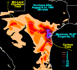 - ↑ (en) David M. Roth, « Storm Total Rainfall From Hurricane Allen (1980) », Weather Prediction Center, (consulté le ).