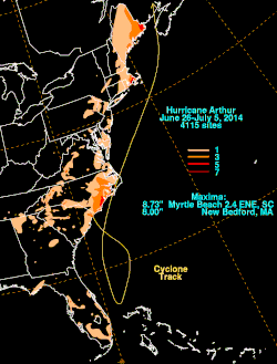 - ↑ (en) Travis Andersen et Claire McNeill, « Arthur douses, but does little damage », The Boston Globe, (lire en ligne, consulté le )