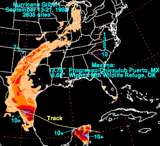 Au total, Gilbert a fait 225 morts au Mexique. Le système a d'abord frappé le Yucatán avant de retourner dans le Golfe du Mexique puis d'atteindre le nord-est du pays.