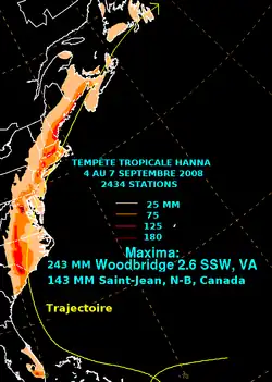 - ↑ (fr) Centre canadien de prévision d'ouragan, « Bulletin sur la tempête tropicale Hanna 4 septembre », Environnement Canada, 4 septembre 2008 à 12 tu (consulté le )