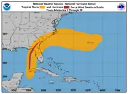 En Floride, 33 comtés de Floride ont été placés en état d'urgence par le gouverneur Ron DeSantis dès le [21]. Deux jours plus tard, le gouverneur a inclus 13 autres comtés[22]. Les écoles de nombreux comtés de l'État, 18 collèges et 6 universités ont suspendu leurs cours à partir du [23],[24],[25],[26]. Des abris d'urgence ont été ouverts dans tout l'État et les ports le long de la côte ouest de la Floride, notamment le port de Tampa (SeaPort Manatee) et le port de St. Petersburg, ont commencé à dégager les voies navigables et à sécuriser les installations[27]. Le district de gestion de l'eau du sud de la Floride et le district de drainage de Lake Worth Beach ont commencé à drainer l'eau des systèmes de canaux[28]. Le pont Howard Frankland, entre Tampa et St. Petersburg, a commencé à sécuriser les barges[29]. Un décret déclarant l'état d'urgence local a été émis pour la ville de Tampa[30]. Les évacuations obligatoires ont commencé dans le comté de Pinellas le [31]. Les équipes de recherche et de sauvetage urbains, composées de près de 600 personnes, ont été activées en Floride[32]. Le parc national des Dry Tortugas a été fermé à l'approche de l'ouragan[33].