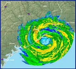 Les pannes électriques dans l’est du Texas ont commencé avant 20 h le , avec la bordure externe du système[86]. Entre 2,8 et 4,5 millions de personnes ont été plongées dans le noir[99],[100]. L’œil de l’ouragan est ensuite passé à Houston, les fenêtres de plusieurs gratte-ciels du centre-ville ont volé en éclats sous la force des vents, dont celles de la tour de 75 étages de JP Morgan Chase (tour JP Morgan Chase), les fils électriques ont été arrachés et le stade de football Reliant a été endommagé, forçant la remise du match entre les Texans de Houston et les Ravens de Baltimore qui devait avoir lieu le [89],[101]. Les bris électriques étaient tellement généralisés que le service ne devait reprendre dans certains secteurs de la ville que le . Heureusement, le passage rapide de la tempête n’a pas permis à l’onde tempête d’aller très loin dans les terres et les inondations ont été minimales dans la ville[89].