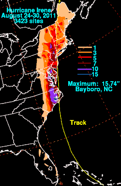 Tout le long de sa trajectoire, Irene a causé des dommages estimés à 7 milliards $US et 44 ou 45 décès[68]. Les vents de force de coup de vent et plus ont affecté toute la côte Est des États-Unis, et aussi loin à l’intérieur des terres que la Pennsylvanie. Les pluies diluviennes ont ajouté à la saturation des sols déjà imbibés des pluies récentes ce qui a causé des inondations et permis de fragiliser la prise des arbres au sol. Les vents ont pu ainsi non seulement causer des dommages aux édifices et aux structures mais ont déraciné un nombre incalculable d’arbres encore plein de feuilles. La tempête a ainsi causé quelques tornades qui ont détruit des maisons. Environ 7,4 millions d’abonnés résidentiels et commerciaux ont été privés d'électricité par suite de la chute de poteaux de distribution électrique ou au bris des fils[69].