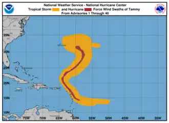 - ↑ (en) Cangialosi, « Post-Tropical Cyclone Tammy Advisory Number 40 », National Hurricane Center, (consulté le ).