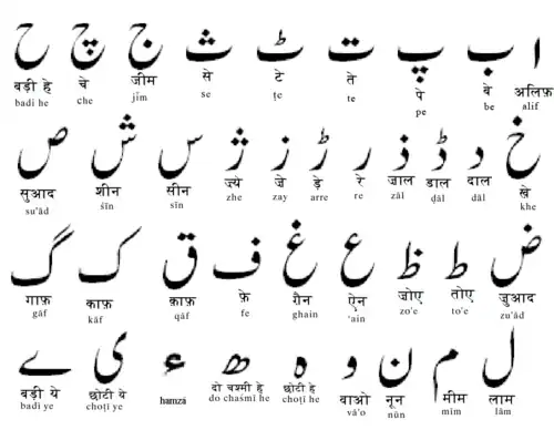 L'alphabet ourdou est une forme modifiée de l'alphabet perso-arabe. Il se compose de 35 signes[23] (ou 37[24],[25], voire 38[26], selon les distinctions introduites entre graphies). Ce nombre plus élevé que celui de l'alphabet perso-arabe (32 ou 33 signes) vient de la nécessité de retranscrire des sons propres aux langues indo-aryennes.