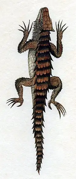 Il possède de larges écailles sur tout le dessus du corps, disposées par rangées latérales, et, derrière la tête, il a fréquemment des protubérances épineuses.