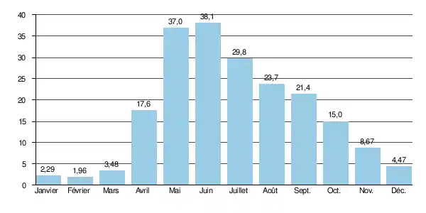 Le débit moyen mensuel observé en février (minimum d'étiage) est de 1,96 m3/s, soit environ 5 % du débit moyen du mois de juin (38,1 m3/s), ce qui souligne l'amplitude importante des variations saisonnières. Ces écarts peuvent être plus importants encore d'après les années : sur la durée d'observation de 59 ans, le débit mensuel minimal a été de 0,44 m3/s en , tandis que le débit mensuel maximal s'élevait à 84,7 m3/s en .