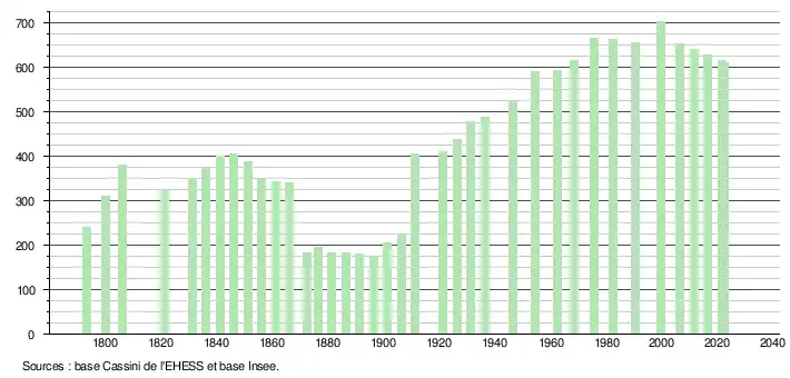 - ↑ Population municipale de référence en vigueur au 1er janvier 2025, millésimée 2022, définie dans les limites territoriales en vigueur au 1er janvier 2024, date de référence statistique : 1er janvier 2022.