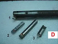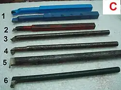 L’outil proprement dit, est de petite dimension, en acier rapide, souvent taillé dans une chute de foret cassé ou un foret à centrer, monté dans un logement percé en bout d’une tige métallique et fixé par une vis pointeau. Utilisé pour les alésages longs demandant une bonne rigidité de l’outil. La partie active peut avoir toutes les formes désirées (filetage, rainurage, alésage, dressage...) (D).