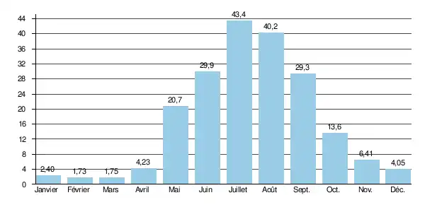 Le débit moyen mensuel observé en février (minimum d'étiage) est de 1,73 m3/s, soit seulement 4 % du débit moyen du mois de juillet, maximum de l'année (43,4 m3/s), ce qui souligne l'amplitude élevée des variations saisonnières. Ces écarts de débit mensuel peuvent être encore plus importants d'après les années. Ainsi sur la durée d'observation de 59 ans, le débit mensuel minimal a été de 0,53 m3/s en , tandis que le débit mensuel maximal s'élevait à 135 m3/s en .