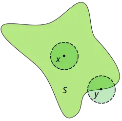Cela signifie que est un ouvert de si pour chacun de ses points x, il contient également les points suffisamment proches de : on peut entourer chaque point en restant dans l'ouvert, donc aucun point de n'est « au bord » de .