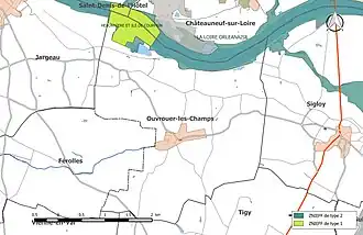 | Vallée de la Loire du Loiret | FR2410017 | ZPS (Directive "Oiseaux") | 4 mai 2007[26] | 7 684 ha | Le site concerne la vallée de la Loire dans le Loiret. Cette ZPS se poursuit en amont et en aval sur les départements voisins. L'intérêt majeur du site repose sur les milieux et les espèces ligériens liés à la dynamique du fleuve. Ces milieux hébergent de nombreuses espèces citées en annexe I de la directive Oiseaux. Le site est caractérisé par la présence de colonies nicheuses de sternes naine et pierregarin et de mouette mélanocéphale. Des sites de pêche du Balbuzard pêcheur sont également présents. Le site est également lieu de reproduction du bihoreau gris, de l'aigrette garzette, de la bondrée apivore, du milan noir, de l'œdicnème criard, du martin-pêcheur, du pic noir, de la pie-grièche écorcheur[INPN 3]. Il est situé dans la frange sud de la commune[25]. |