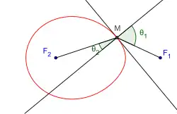 Ainsi, si on appelle θ1 l'angle que fait F1M avec la normale et θ2 l'angle que fait F2M avec la normale, on a l'égalité : .