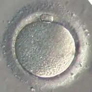 Chez les animaux l'ovogenèse, ou gamétogenèse femelle animale, est un processus biologique discontinu aboutissant à la formation d'un gamète femelle animal mature apte à donner par fécondation la cellule œuf. Chez les animaux ce gamète femelle se nomme l'ovocyte (ou ovocyte II ou ovule, sous sa forme fécondable). L'ovocyte II chez la femme, dans sa forme la plus mature, est une cellule sexuelle mesurant entre 110 et 120 µm[1] (30 µm au début de sa croissance). L'ovogenèse commence dans les ébauches embryonnaires des futurs ovaires et se termine théoriquement peu après la fécondation avec expulsion du second globule polaire (dans les trompes de Fallope chez l'humain).