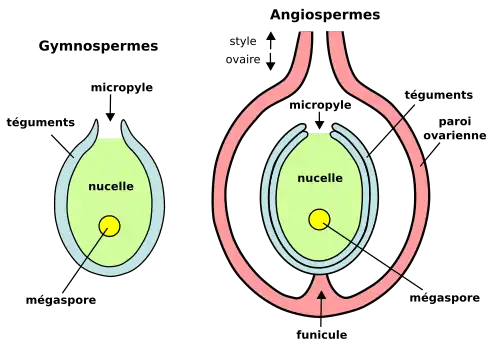 L’ovule des végétaux est très différent d’un gamète animal : il est composé d'un sac embryonnaire composé de cellules haploïdes correspondant à un gamétophyte, formé à partir d'une mégaspore. Celui-ci est entouré d'un nucelle diploïde, puis d'un ou deux enveloppe(s) ou tégument(s) diploïde(s), s'ouvrant sur l'extérieur par une ouverture appelée micropyle.