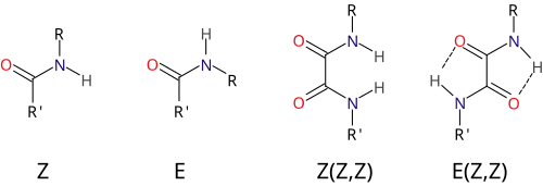 L'oxamide est le composé parent de la famille des oxamides de formule générale (R1,R2)N-CO-CO-N(R3,R4). Les oxamides primaires de formule R1-NH-CO-CO-NH-R2 adoptent plus volontiers une conformation E(Z,Z) avec donc les amides en position Z -Les amides E (cis) ne sont rencontrés que dans des cycles lactames de moins de dix atomes[4]- ce qui permet la formation de cycles à 5 par liaison hydrogène tandis que les oxamides Z(Z,Z) sont déstabilisés par hyperconjugaison et gêne stérique entre les deux atomes d'hydrogène[5].