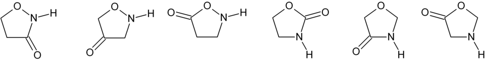 de gauche à droite : 1,2-oxazolidine-3-one, 1,2-oxazolidine-4-one, 1,2-oxazolidine-5-one, 1,3-oxazolidine-2-one, 1,3-oxazolidine-4-one, 1,3-oxazolidine-5-one.