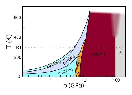 - phase δ orange à température ambiante sous une pression d'environ 9 GPa ;