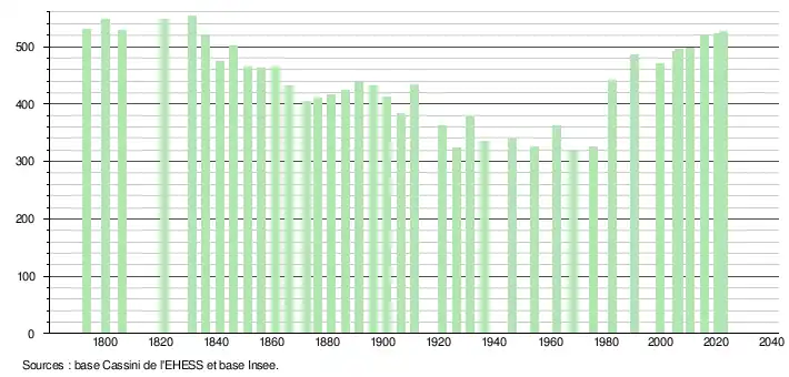 L'évolution du nombre d'habitants est connue à travers les recensements de la population effectués dans la commune depuis 1793. Pour les communes de moins de 10 000 habitants, une enquête de recensement portant sur toute la population est réalisée tous les cinq ans, les populations de référence des années intermédiaires étant quant à elles estimées par interpolation ou extrapolation[21]. Pour la commune, le premier recensement exhaustif entrant dans le cadre du nouveau dispositif a été réalisé en 2005[22].