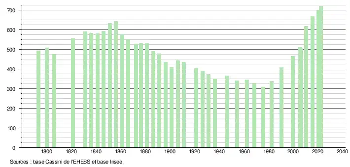 L'évolution du nombre d'habitants est connue à travers les recensements de la population effectués dans la commune depuis 1793. Pour les communes de moins de 10 000 habitants, une enquête de recensement portant sur toute la population est réalisée tous les cinq ans, les populations de référence des années intermédiaires étant quant à elles estimées par interpolation ou extrapolation[32]. Pour la commune, le premier recensement exhaustif entrant dans le cadre du nouveau dispositif a été réalisé en 2005[33].