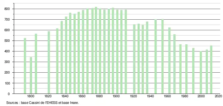 L'évolution du nombre d'habitants est connue à travers les recensements de la population effectués dans la commune depuis 1793. À partir du , les populations légales des communes sont publiées annuellement dans le cadre d'un recensement qui repose désormais sur une collecte d'information annuelle, concernant successivement tous les territoires communaux au cours d'une période de cinq ans. Pour les communes de moins de 10 000 habitants, une enquête de recensement portant sur toute la population est réalisée tous les cinq ans, les populations légales des années intermédiaires étant quant à elles estimées par interpolation ou extrapolation[5]. Pour la commune, le premier recensement exhaustif entrant dans le cadre du nouveau dispositif a été réalisé en 2006[6],[Note 1].