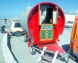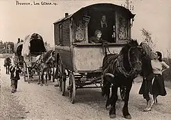 Au cœur des Saintes se trouve la place des Gitans. Là stationnaient et stationnent encore, nombre de caravanes[5], tandis que les huit ou dix mille gens du voyage s'installent péniblement dans le bourg camarguais. Les caravanes forment une cité éphémère avec ses avenues, ses venelles et ses quartiers[13].