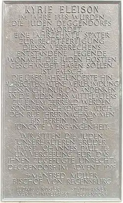 - « Kyrie Eleison. En 1338, les juifs de Deggendorf ont été assassinés. Pour justifier ce crime une légende est née une dizaine d’années plus tard, selon laquelle les Juifs auraient profané des hosties. Entretenue pendant des siècles, cette calomnie n'a pas seulement créé une image déformée des Juifs du Moyen Âge, mais a entaché aussi la réputation de leurs descendants jusque dans le passé le plus récent. Nous demandons pardon aux Juifs, « nos frères ainés » (pape Jean-Paul II), pour l'injustice qui leur a été faite. Deggendorf, pendant l'Avent 1993. Manfred Müller, évêque de Ratisbonne. Ludwig J. Rösler, curé de l’église de l’Assomption à Deggendorf[4].