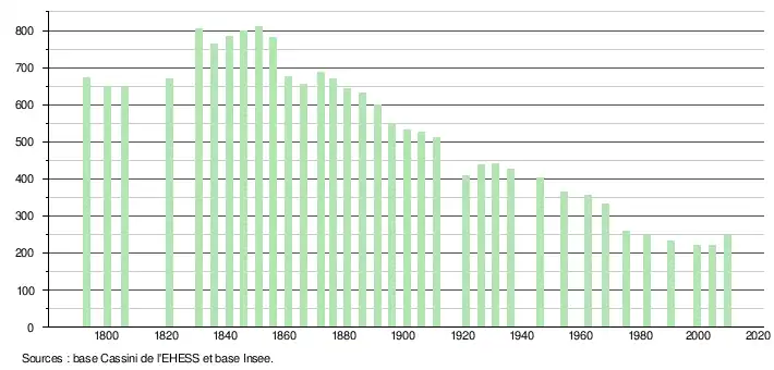 - ↑ Par convention dans Wikipédia, le principe a été retenu de n’afficher dans le tableau des recensements et le graphique, pour les populations légales postérieures à 1999, que les populations correspondant à une enquête exhaustive de recensement pour les communes de moins de 10 000 habitants, et que les populations des années 2006, 2011, 2016, etc. pour les communes de plus de 10 000 habitants, ainsi que la dernière population légale publiée par l’Insee pour l'ensemble des communes.