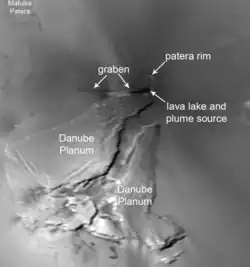 Il a été baptisé Pélé par l'Union astronomique internationale en référence à la déesse des volcans hawaïens. Il est situé par 18,7° S et 255,3° W. Le Pélé est formé d'une grande dépression volcanique de trente kilomètres de longueur par vingt kilomètres de largeur, à la base nord d'un vaste plateau appelé Danube Planum. Un grand lac de lave basaltique remplit la dépression, libérant dans l'espace de gigantesques quantités d'énergie[2]. Ce lac de lave est également la source d'un panache volcanique de gaz et de poussière pouvant atteindre 300 kilomètres de hauteur au-dessus de la lune jovienne. Il retombe cependant à la surface de l'astre pour y déposer un anneau de matériaux rouges bien visibles jusqu'à 600 kilomètres du volcan[3].