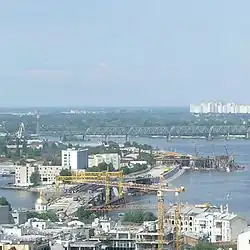 Vue générale de la péninsule vue depuis Podil. Au fond à gauche les tours du quartier d'Obolon.