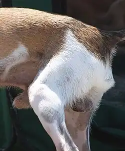 Contrairement à ce qui se passe chez l'homme, le frenulum préputial (frenulum praeputii), qui relie le gland et le prépuce, est déchiré chez le chien avant la maturité sexuelle. L'ancienne connexion reste visible sous la forme d'une "couture" (rafhe) sur toute la longueur du gland. Toutefois, dans de rares cas, le frenulum peut rester en place jusqu'à la maturité sexuelle et empêcher alors le mâle de creuser. Cette affection est rare et peut être facilement traitée par le vétérinaire.