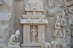On retrouve Arjuna dans une autre scène importante qui est celle d'un petit temple à droite de la faille à l'extrémité inférieure du panneau. Ce temple petit et simple est dédié à Vishnou qui est représenté à l'intérieur. Le temple s'inspire du style de la Draupadi des Cinq Ratha avec une tour carrée à dôme curviligne avec une stupi. Les coins sont décorés de motifs floraux, les corniches sont également visibles avec des " kudus " sculptés avec des visages humains à l'intérieur. Dans le plancher au-dessus de la corniche, des motifs de lion sont sculptés. Un carré supporte le toit en dôme. On voit Arjuna assis devant le temple. Une tortue est figurée tout en bas indiquant la présence d'eau dans le voisinage immédiat[9].