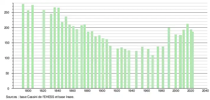 | L'évolution du nombre d'habitants est connue à travers les recensements de la population effectués dans la commune depuis 1793. Pour les communes de moins de 10 000 habitants, une enquête de recensement portant sur toute la population est réalisée tous les cinq ans, les populations de référence des années intermédiaires étant quant à elles estimées par interpolation ou extrapolation[46]. Pour la commune, le premier recensement exhaustif entrant dans le cadre du nouveau dispositif a été réalisé en 2005[47]. En 2022, la commune comptait 186 habitants[Note 6], en évolution de −12,26 % par rapport à 2016 (Ariège : +1,48 %, France hors Mayotte : +2,11 %). |
