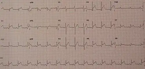 Ces anomalies sont diffuses dans toutes les dérivations et concordantes, sans image en miroir. Il existe rarement un aspect de bas voltage diffus lorsque l'épanchement est important. Il y a parfois des troubles du rythme auriculaire, fibrillation et flutter auriculaire[6].